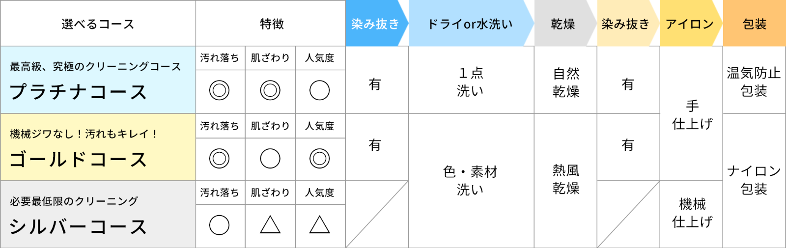※礼服や綿、麻、シルクなどの商品、外注品や特殊品はコースをお選びいただけない場合があります。