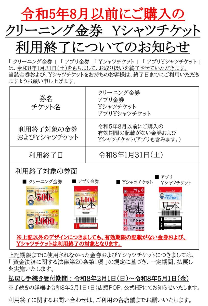 令和5年8月以前にご購入のクリーニング金券 Yシャツチケット 利用終了についてのお知らせ
