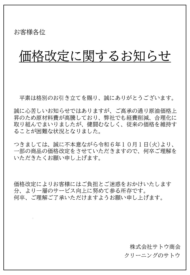 価格改定に関するお知らせ 2024.09.24 最新記事 2026.03.09 エアコンクリーニングキャンペーンのお知らせ お知らせ 2025.07.23 クリーニングのサトウ 石坂店 営業時間の変更のお知らせ お知らせ 2025.07.19 クリーニングのサトウ萩丘店・鷲津店 休憩時間導入による営業時間の変更のお知らせ お知らせ 2025.06.12 【静岡新聞に掲載】クリーニングのサトウ萩丘店 お知らせ 2025.06.01 クリーニングのサトウ 焼津店 コインランドリーリニューアルOPENのお知らせ お知らせ サイト内検索 カレンダー 1 カテゴリ一覧 お知らせ アーカイブ 2026 2025 2024 2023 2022 2021