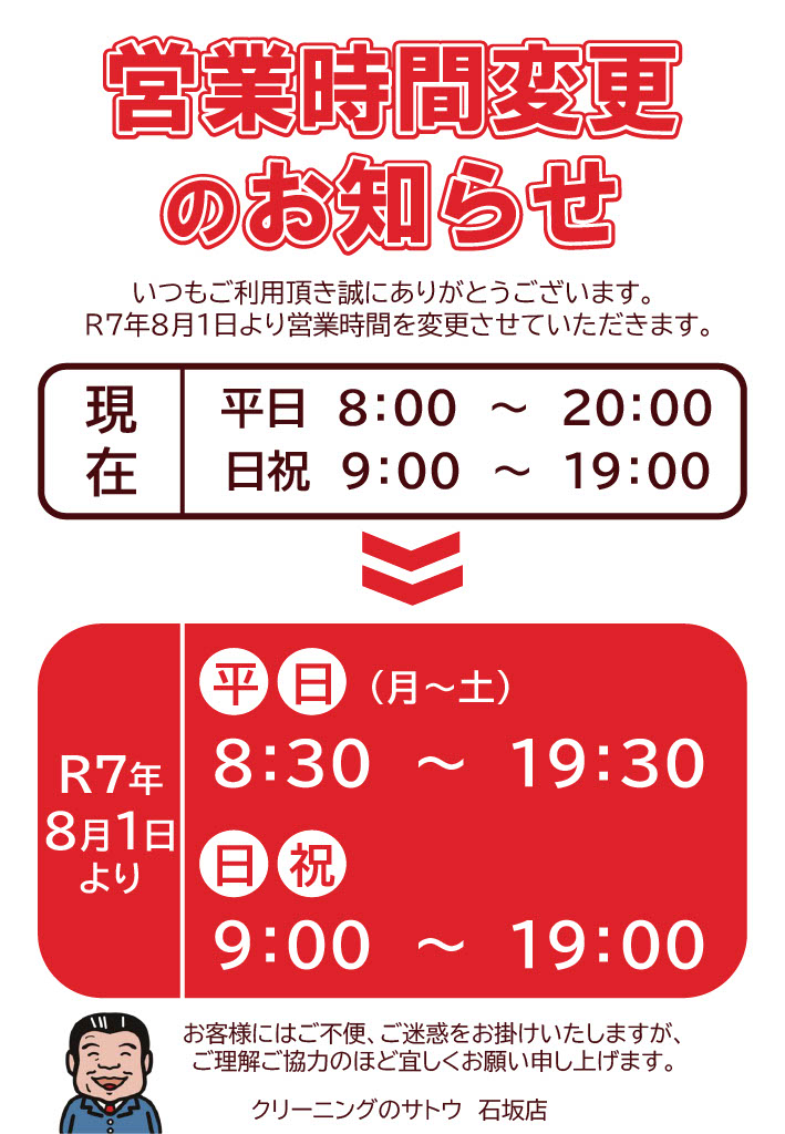 クリーニングのサトウ 石坂店 営業時間の変更のお知らせ