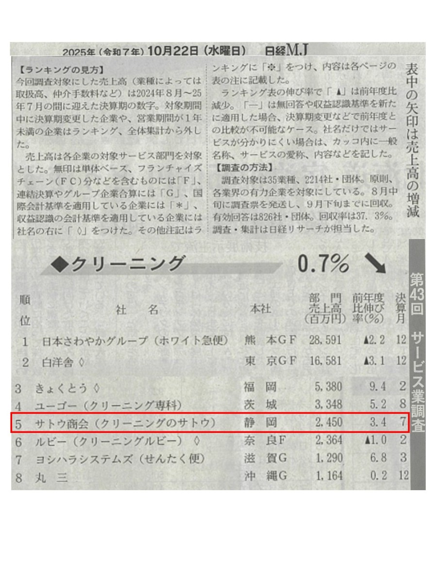 その結果、クリーニングのサトウ(株式会社サトウ商会)は、おかげさまで、クリーニング部門の売上高ランキングで今年は全国5位になりました。