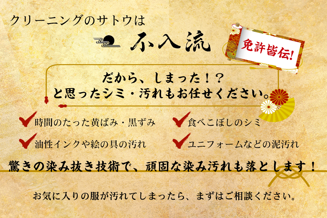 不入流(いらず流)免許皆伝の資格を持つ職人のいるクリーニングのサトウなら、お役に立てるかもしれません。